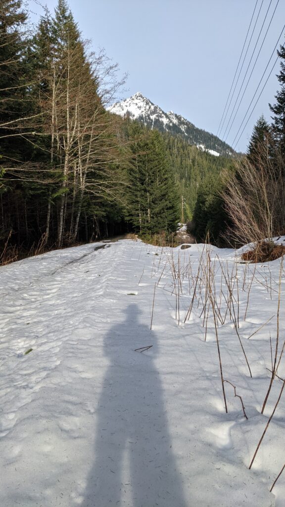 The Snoqualmie Valley trail dumps into the King county Rattlesnake Lake recreation area parking lot. Continue to follow the road or trail along, away from the lake, and you’ll find the State Park trail head. Follow the signs a short ways, and soon you’re on the old Milwaukee road, at Cedar Falls, headed east (and up – to Snoqualmie Pass).