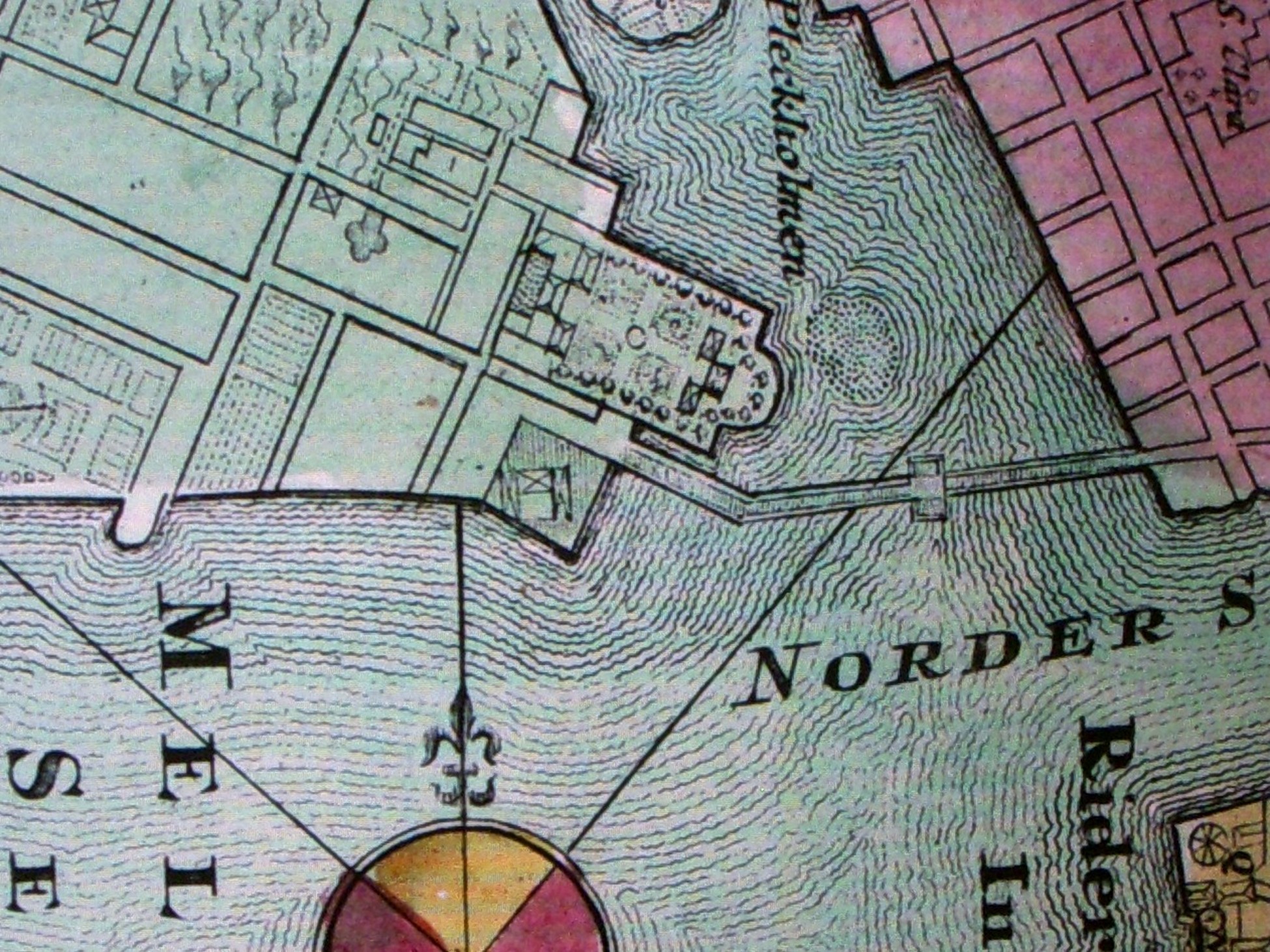 The completed layout, and a sense of the garden be seen on the 1724 map by Johann Baptist Homann. Gripenhielm abuts the bridge, ringed by trees, above the word “Norder.”