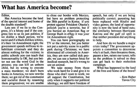 So, when Mr. Huber asks “what has happened to the land of the free and home of the brave?” I answer: it is growing up. And he is looking rather childish.