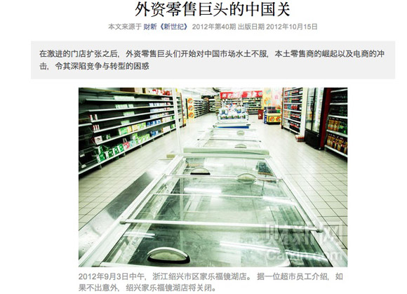 Cai Xin’s headline “Winds of Change” implies unpredictablity, yet what foreign retailers are facing is less so. Is it perhaps another victory for “National Champions”? Foreign retailers’ business is slowing, with some leaving china. Why? What caught my attention are the unclear assertions.