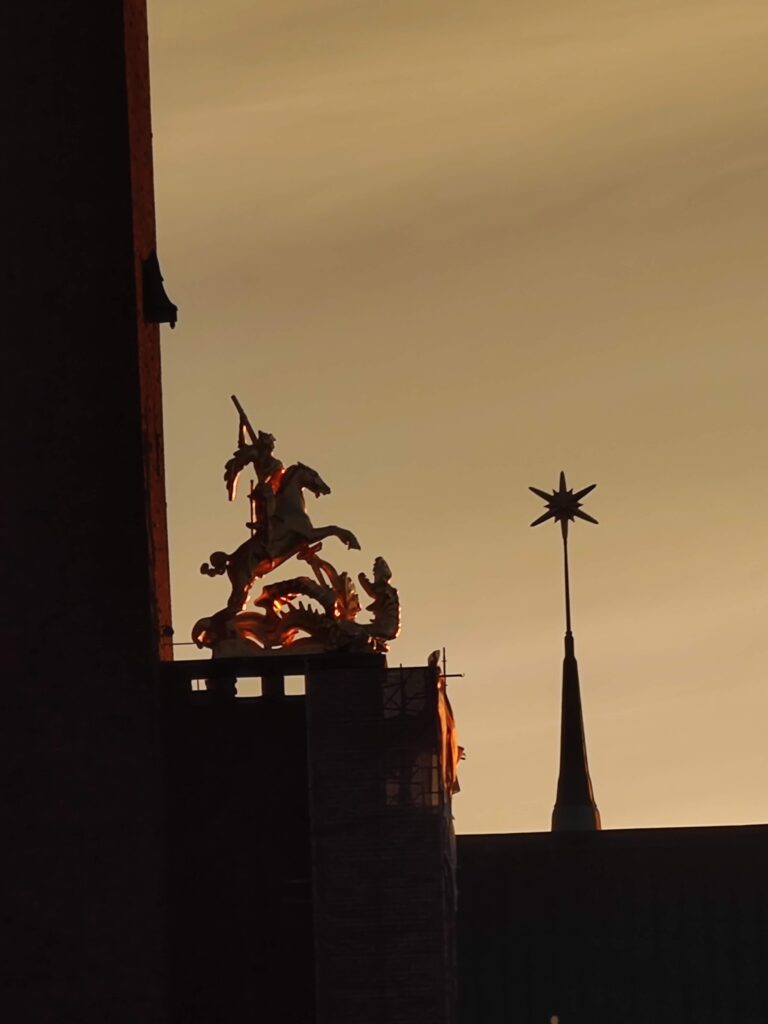 Across the way is the Stockholm City Hall. It appears older to me, but was completed in 1923. I guess it’s because of the bricks used, which match the much older construction around the city. Reportedly, this was on purpose – and I love it! The location was also chosen for it’s position between water, land and architecture. Additionally, there are touchstones to bygone eras. For example, the cenotaph (an empty grave) of Birger Jarl, forever looking over the city. Well, except he’s not really in there of course. Or the statue of St. Goran (George) conquering the dragon. Or the seemingly mystical astrological symbols in glittering gold around the roof.